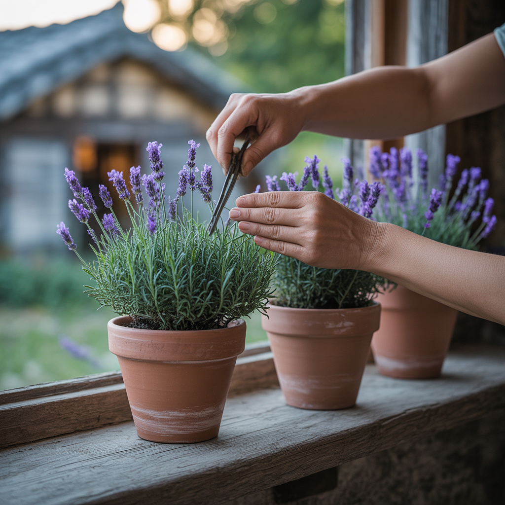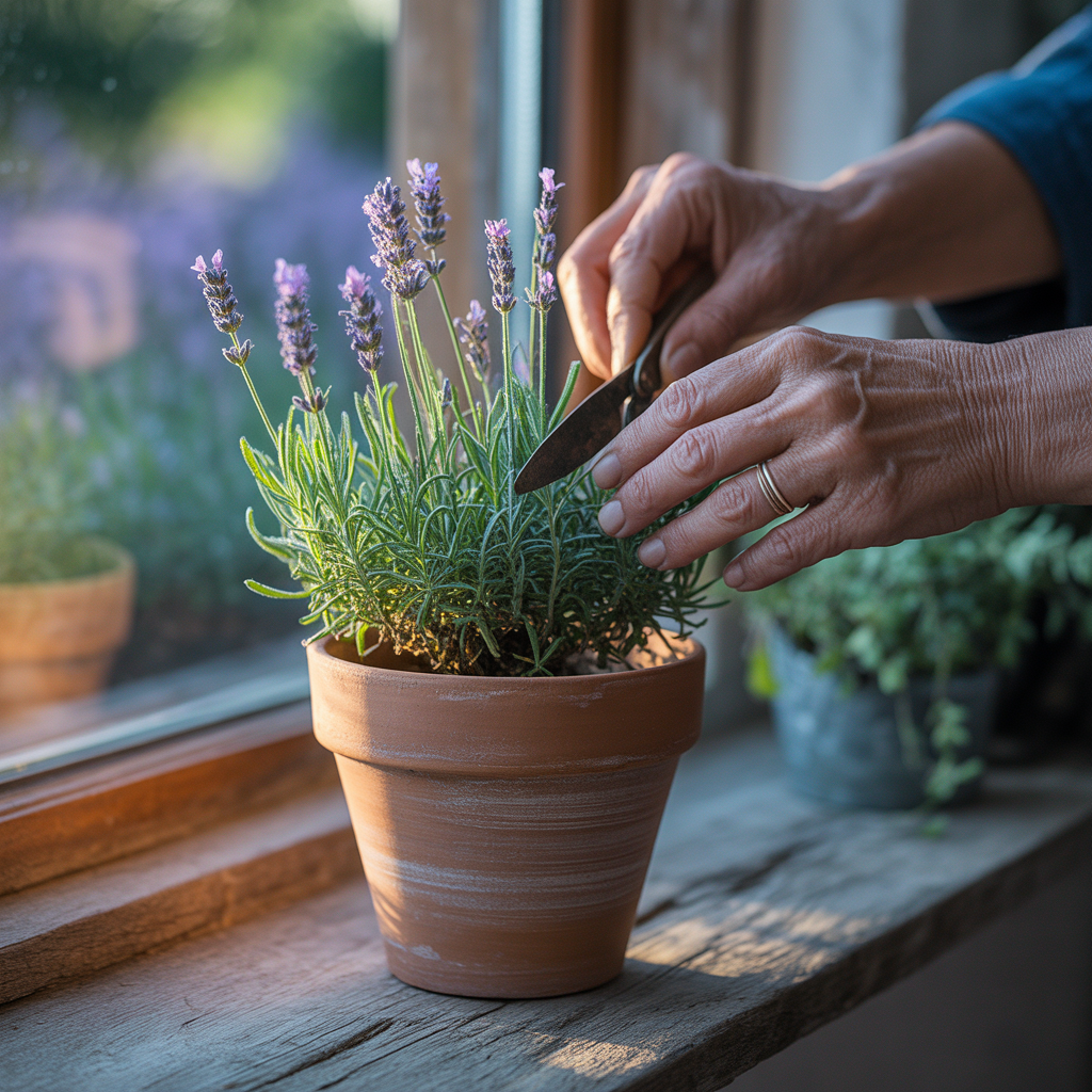 라벤더는 뿌리가 깊게 뻗기 때문에 화분은 깊이 25cm 이상, 넓이는 30cm 이상이면 좋아요. 배수구가 반드시 있어야 하고, 맨 아래에는 마사토를 깔아 배수성을 높여주는 게 포인트예요.