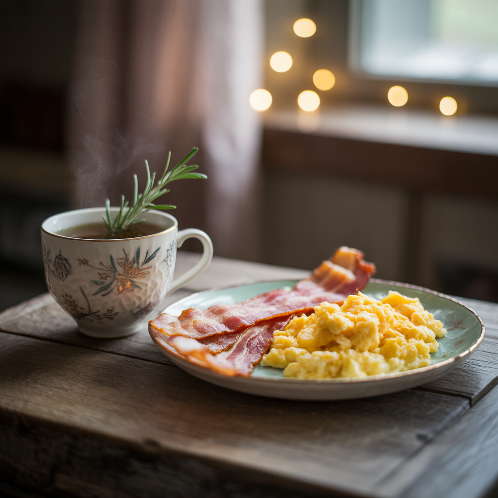 아침 식사로는 너무 무겁지 않으면서도, 로즈마리 차의 향과 어울리는 메뉴가 좋아요. 예를 들어, 달걀 요리나 치즈, 베이컨과 곁들인 브레드류가 좋아요.
