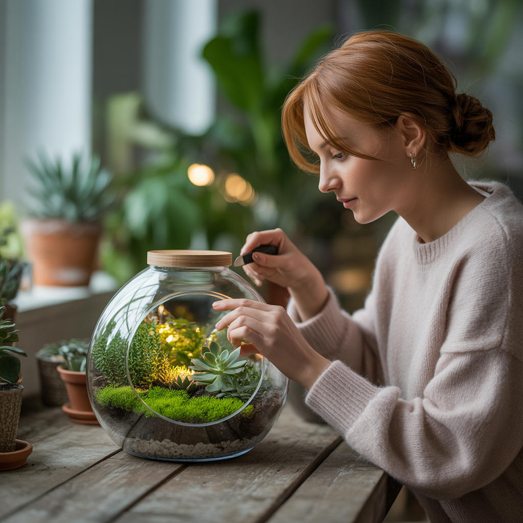 작은 유리병이나 아크릴 용기에 작은 식물들을 심어 아기자기한 정원을 만드는 방식이에요. 마치 나만의 작은 숲을 유리 안에 가두는 느낌이죠. 다육이류, 선인장, 이끼류 식물들이 잘 어울려요.